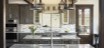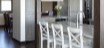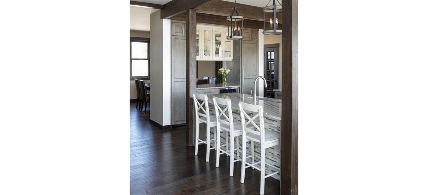 Dining room pass through is flanked by custom paneled Thermador refrigerator and freezer