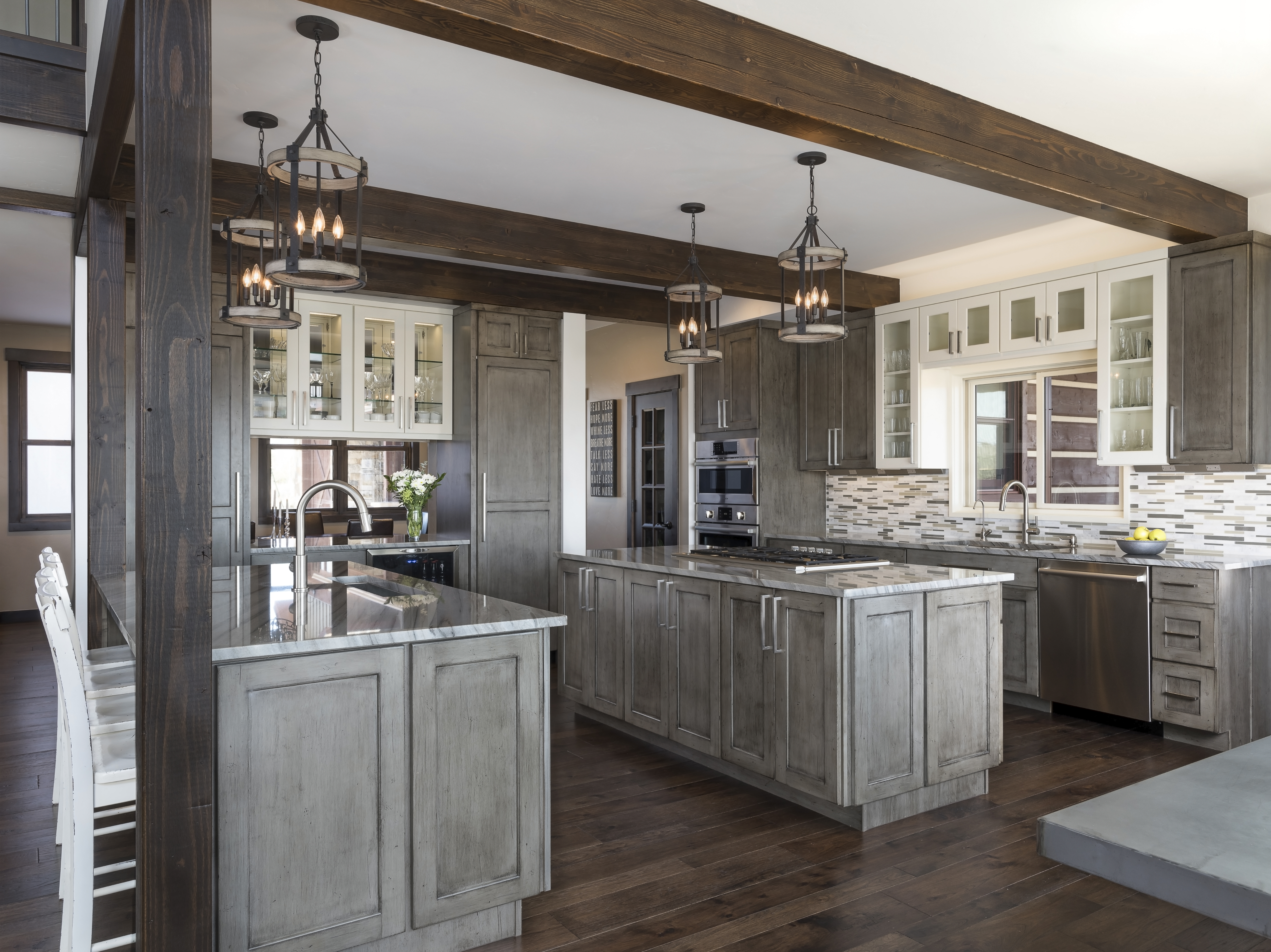 Two tone kitchen cabinets complement backsplash